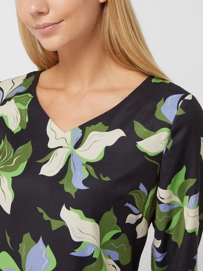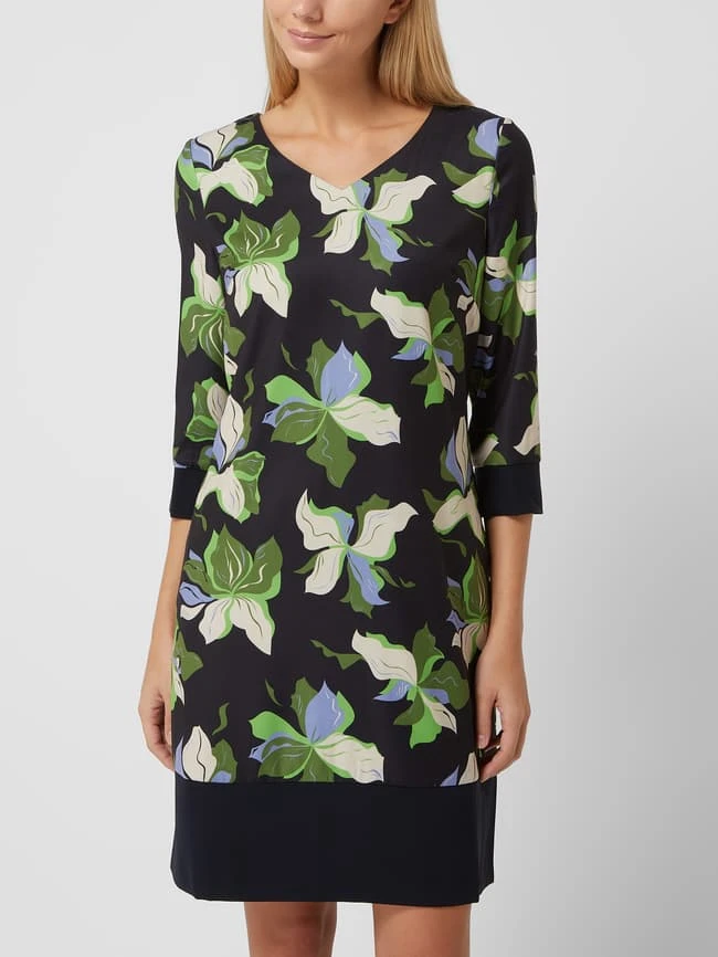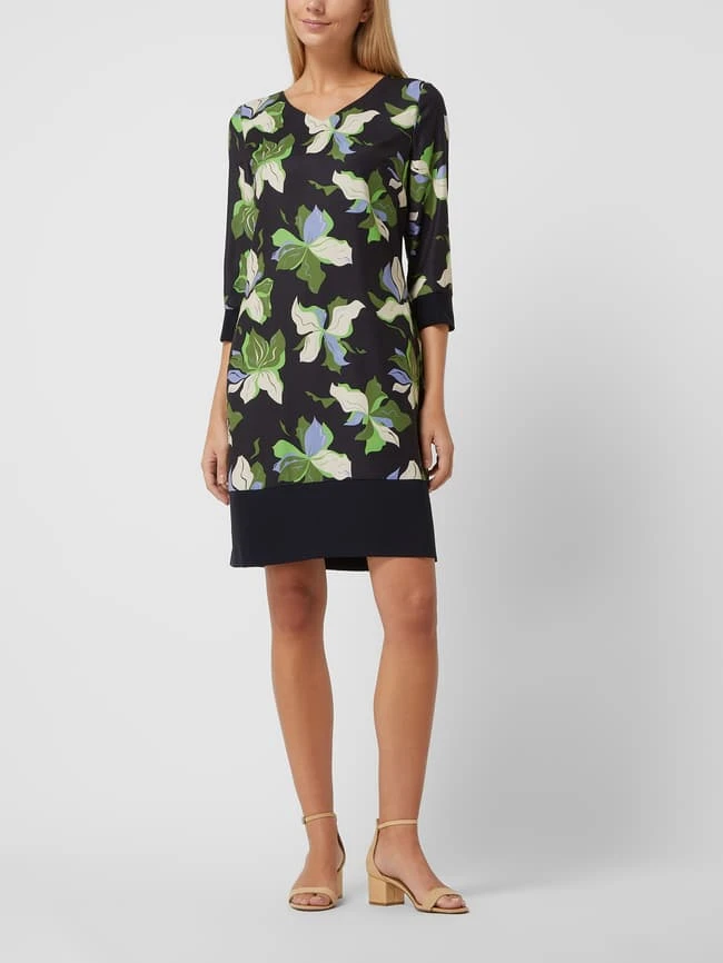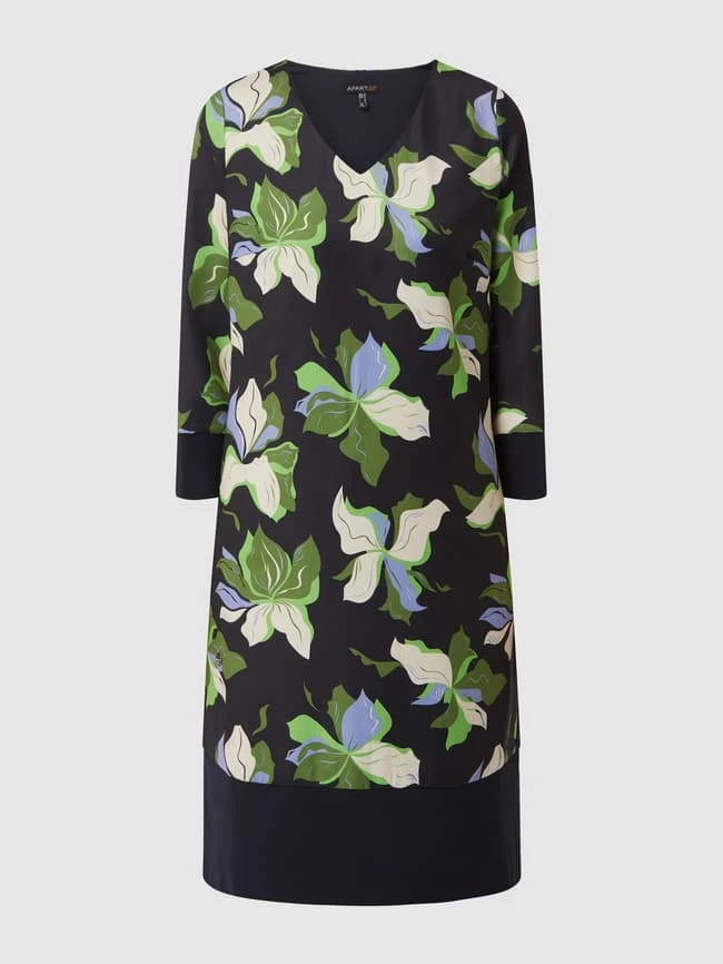 Das Kleid von APART ist aus Jersey gefertigt und kommt in taillierte Passform. Es zeigt sich mit floralem Muster und kommt mit 3/4-Arm.