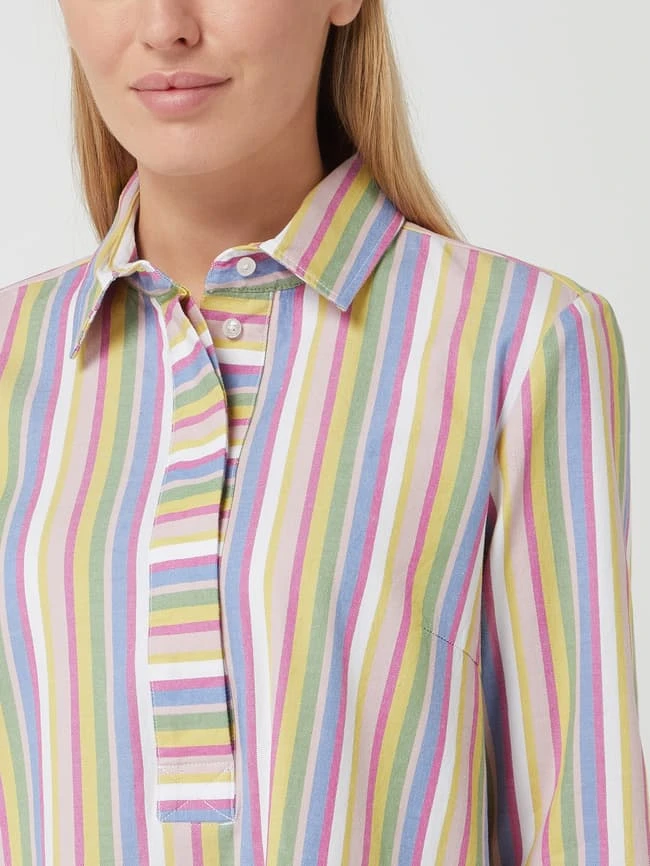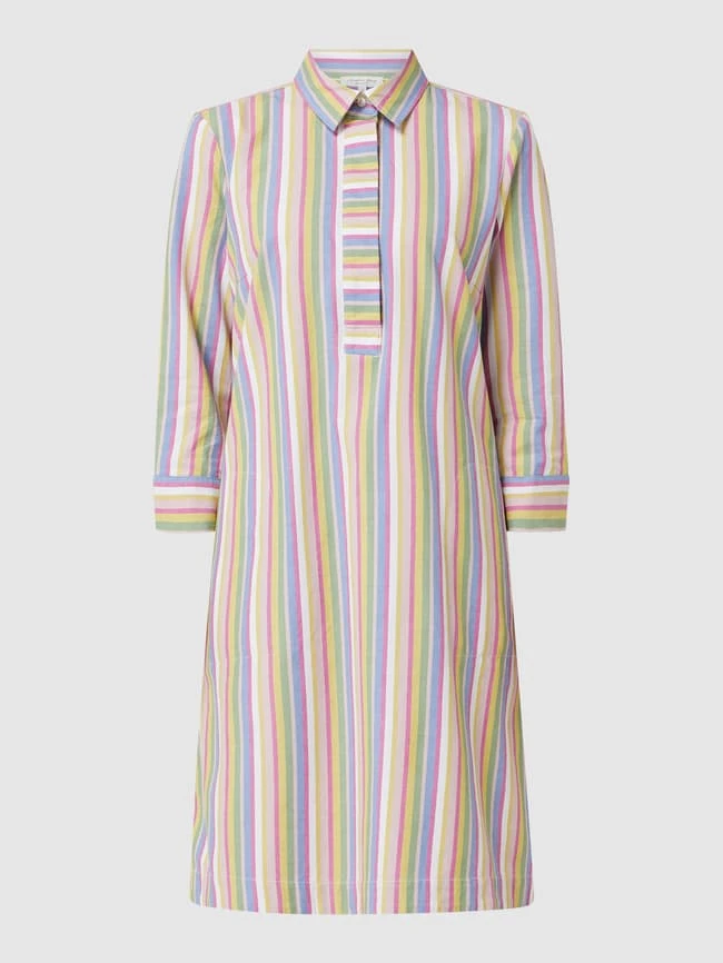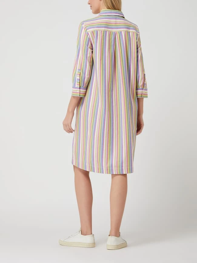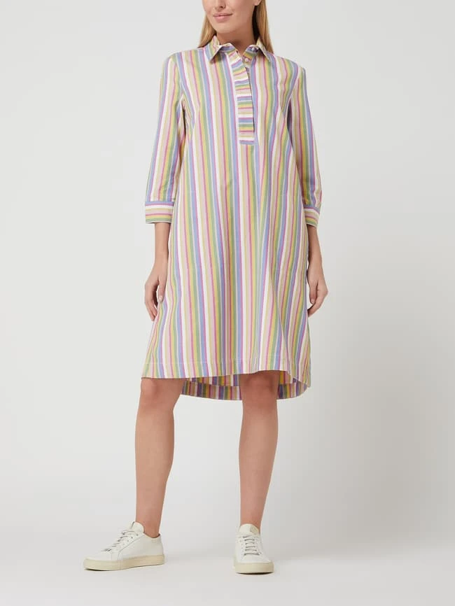 Das Blusenkleid von Christian Berg Woman ist aus reiner Baumwolle gefertigt. Es zeigt sich in ausgestellter Passform mit Streifenmuster, Umlegekragen und 3/4-Arm.