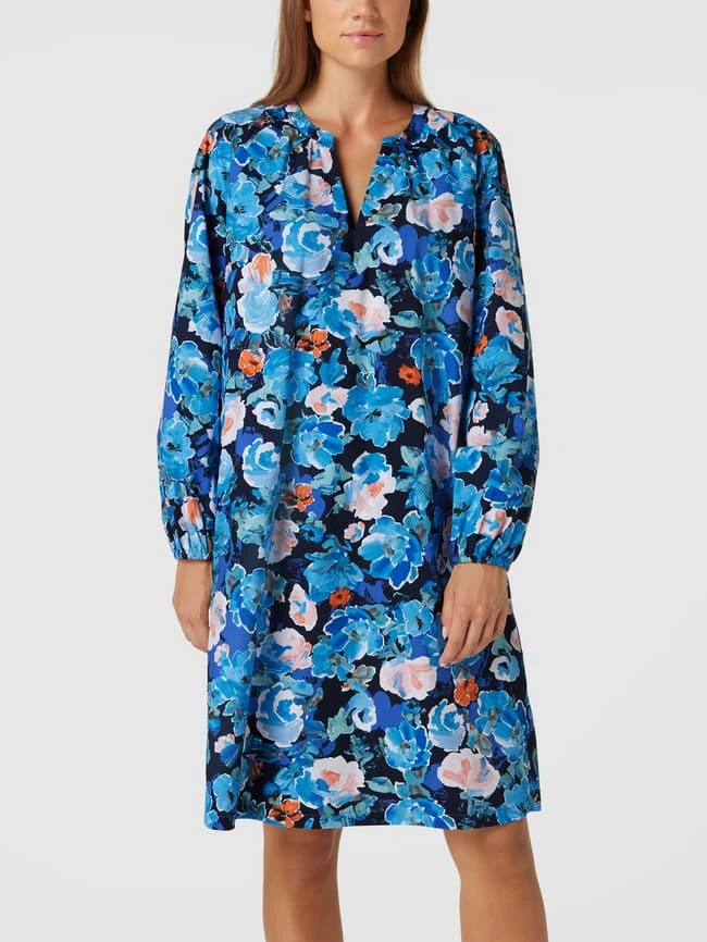Das knielange Kleid von Christian Berg Woman ist aus reiner Baumwolle gefertigt und locker geschnitten. Es zeigt sich mit floralem Allover-Muster und V-Ausschnitt.
