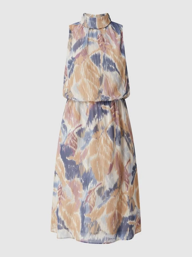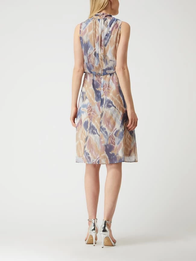 Das Kleid von comma ist aus Chiffon gefertigt und tailliert geschnitten. Es zeigt sich mit locker fallendem Oberteil, Stehkragen und Gummizug auf Taillenhöhe.