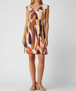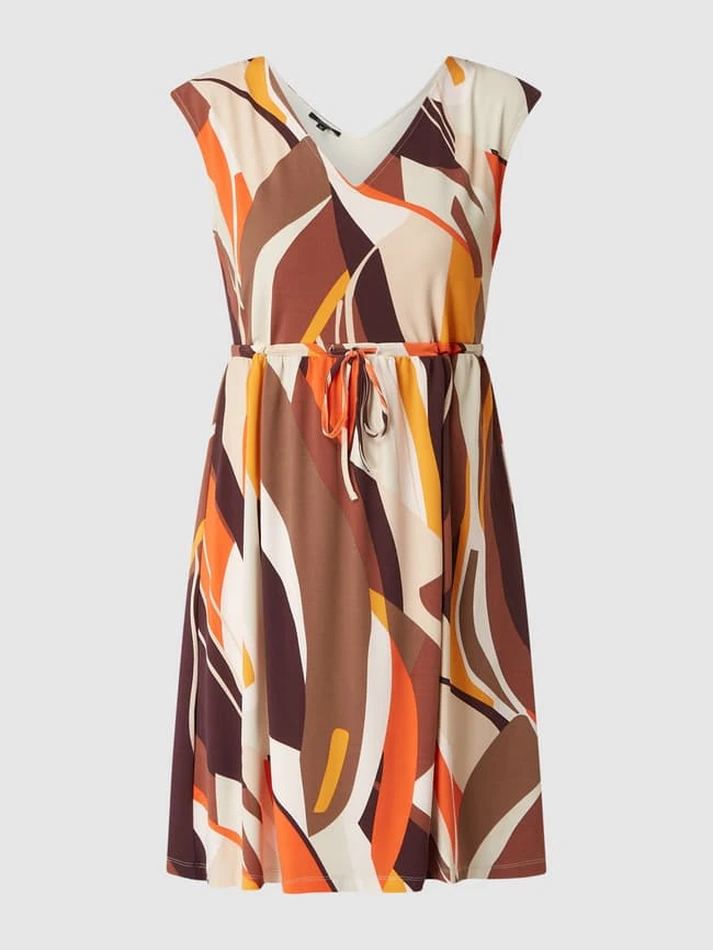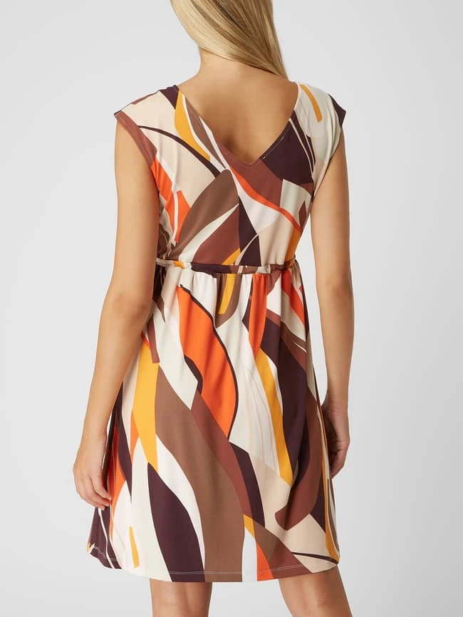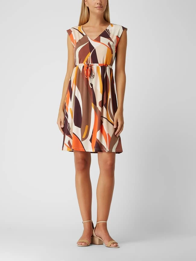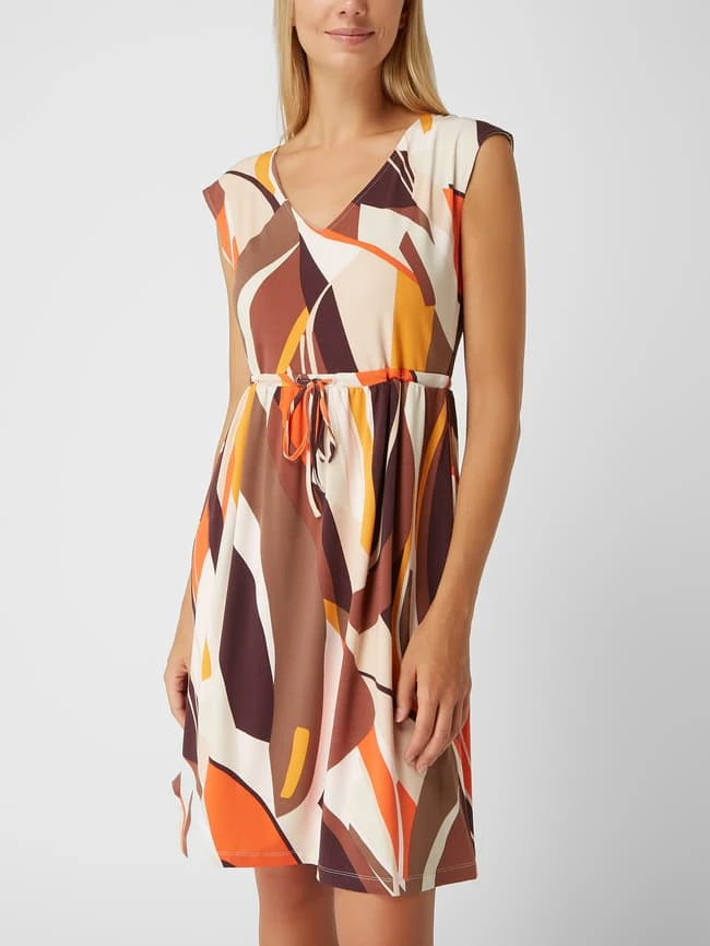 Das Kleid von comma ist aus einer Materialmischung mit Stretch-Anteil gefertigt. Es zeigt sich in taillierter Passform mit grafischem Muster, V-Ausschnitt und Tunnelzug im Taillenbereich.