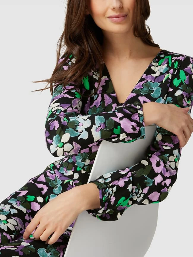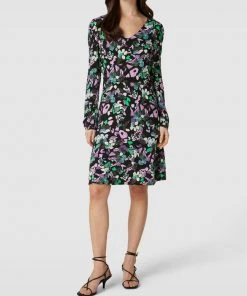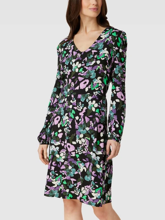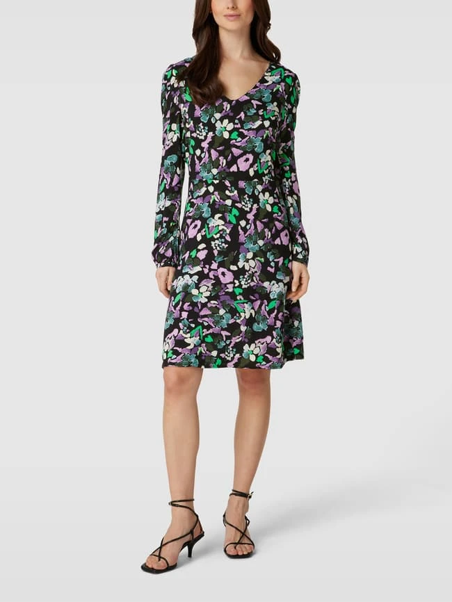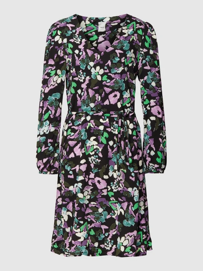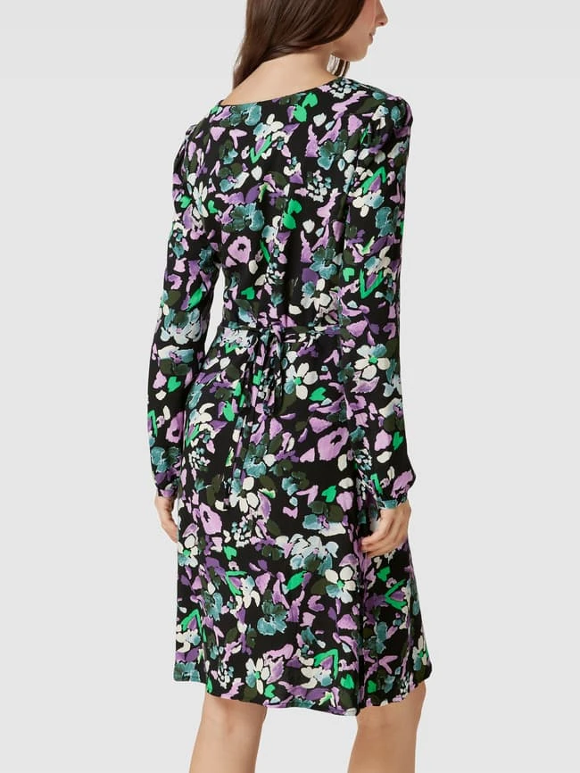 Das knielange Kleid ist aus reiner Viskose gefertigt und in leicht ausgestelltem Schnitt gefertigt. Es zeigt sich mit floralem Muster, Taillengürtel sowie V-Ausschnitt.