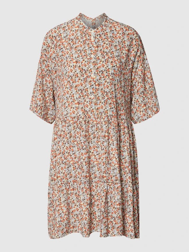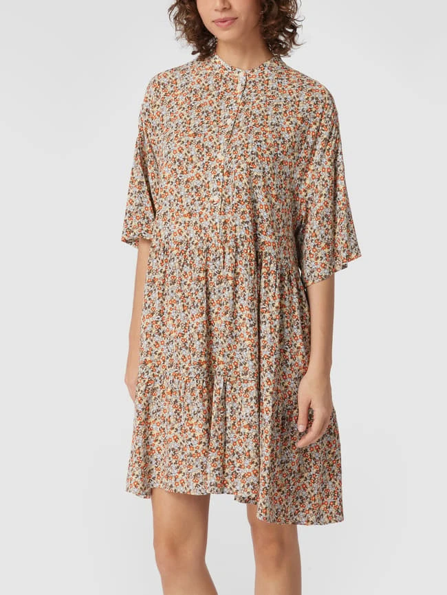 Das knielange Kleid von Jake*s Casual ist aus reiner Viskose gefertigt und locker geschnitten. Es kommt mit floralem Allover-Muster, gelegten Falten und Volantsaum sowie Rundhalsausschnitt mit Knopf.
