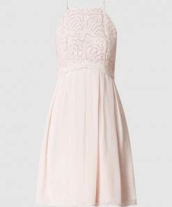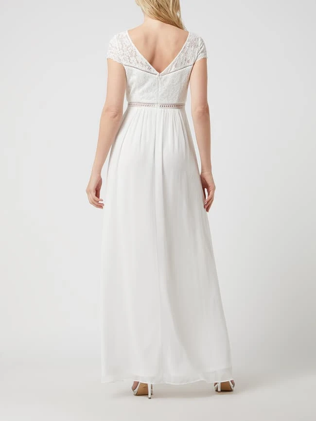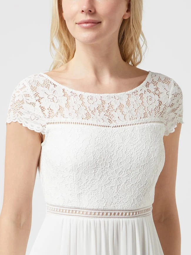 Das Abendkleid von Jake*s Cocktail ist aus floraler Spitze und Chiffon gefertigt. Es zeigt sich in taillierter Passform mit Kappärmeln, Zierborte aus Häkelspitze und blickdichtem Unterkleid.