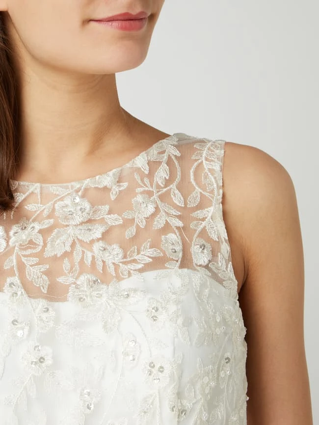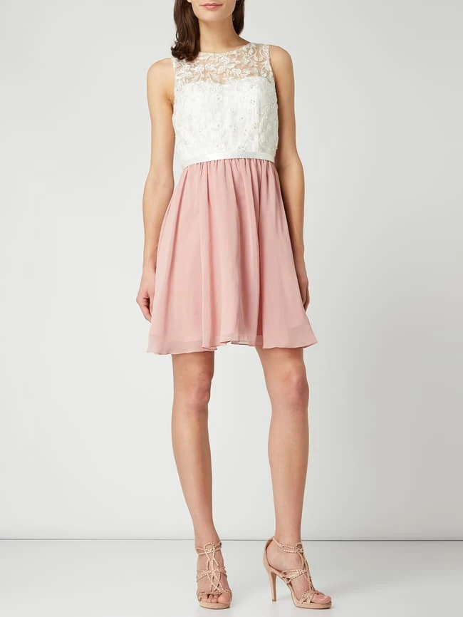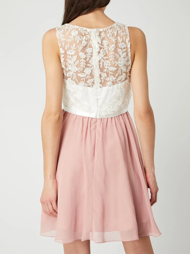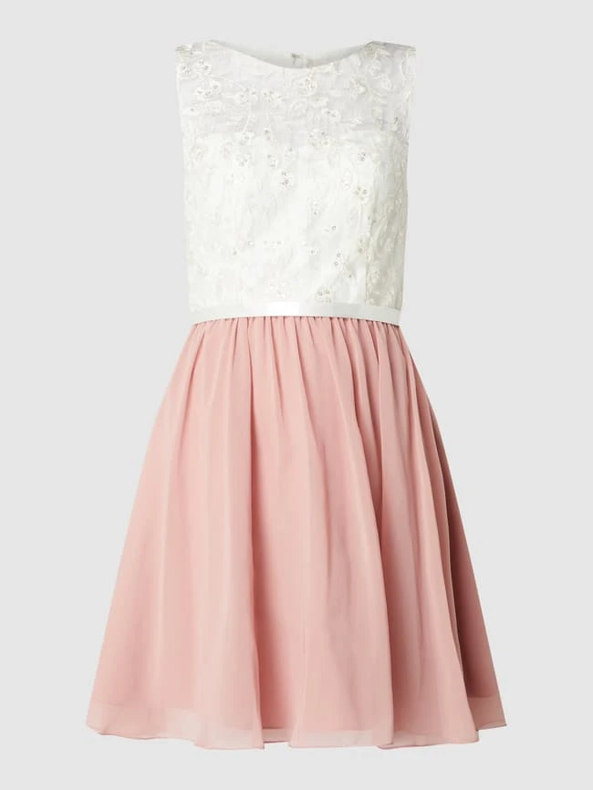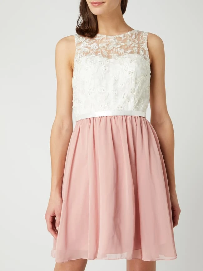 Das Cocktailkleid von LAONA ist aus Mesh und Chiffon gefertigt. Es zeigt sich in taillierter Passform mit floralen Stickereien, Pailletten und kontrastfarbenem Rockteil.