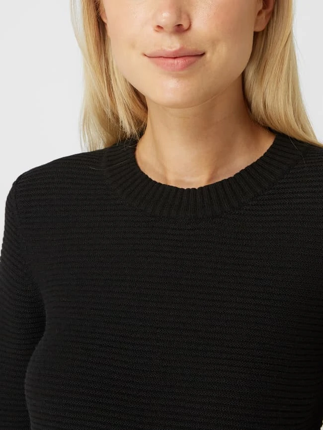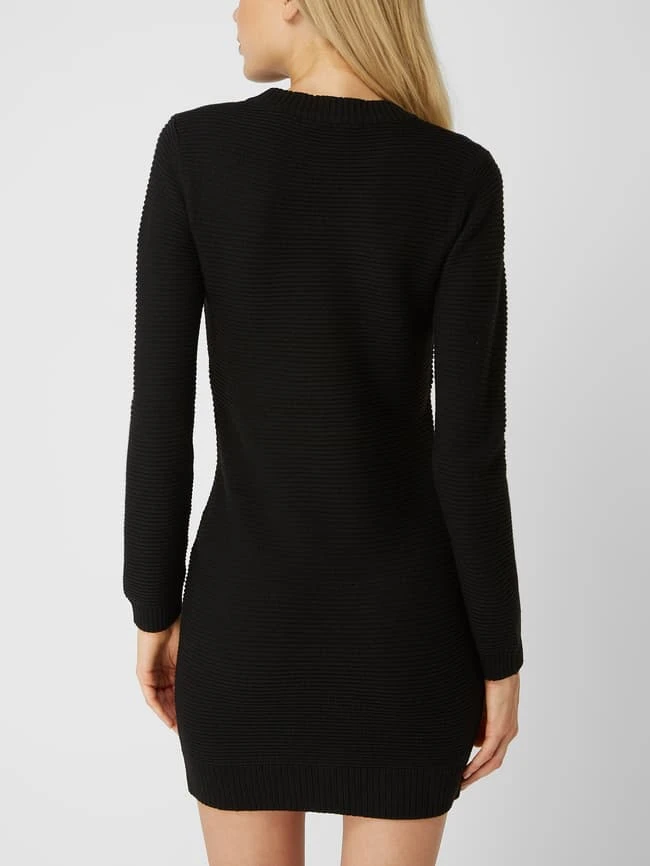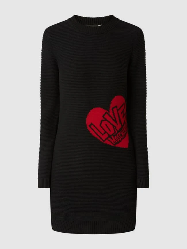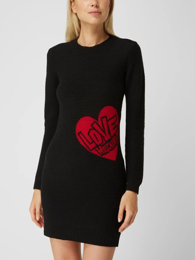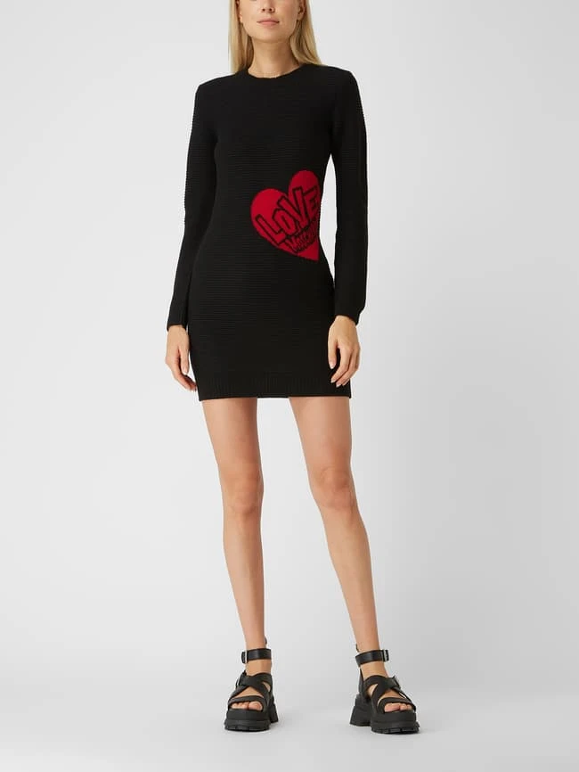 Das Kleid von Love Moschino ist aus einer Wollmischung mit Viskose- und Stretch-Anteil gefertigt. Es zeigt sich in eng anliegender Passform mit Rippenstruktur, langen Ärmeln und Herz-Print.
