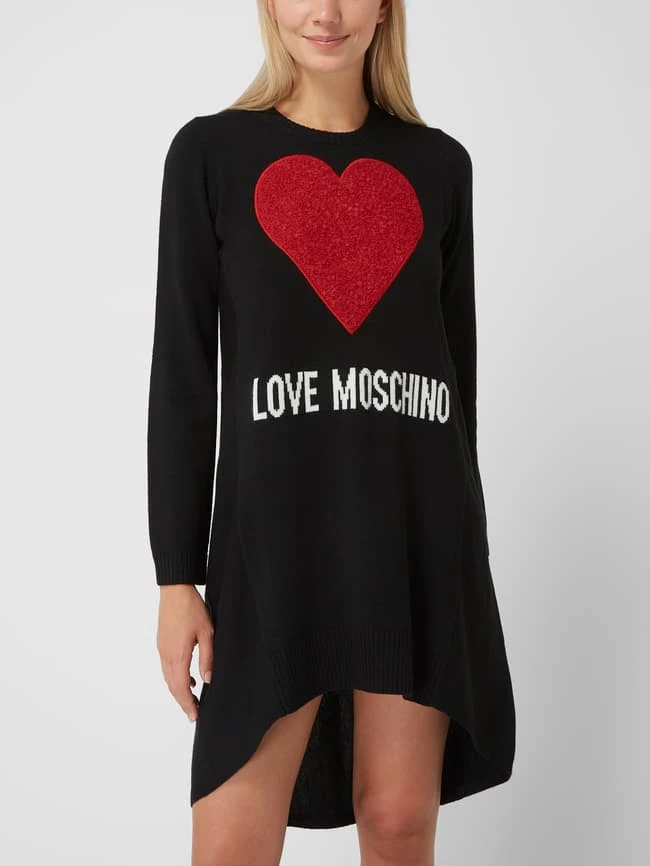 Das Strickkleid von Love Moschino ist aus einer Materialmischung mit Woll-Anteil gefertigt. Es kommt in ausgestellter Passform mit Rundhalsausschnitt, langen Ärmeln und Herz-Stickerei.