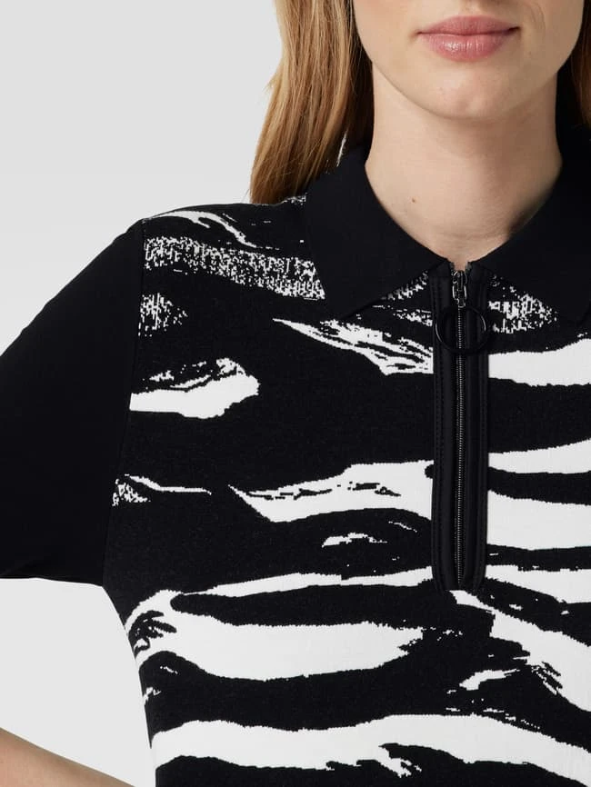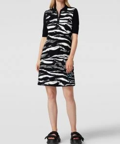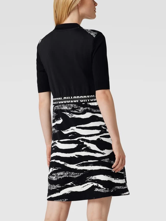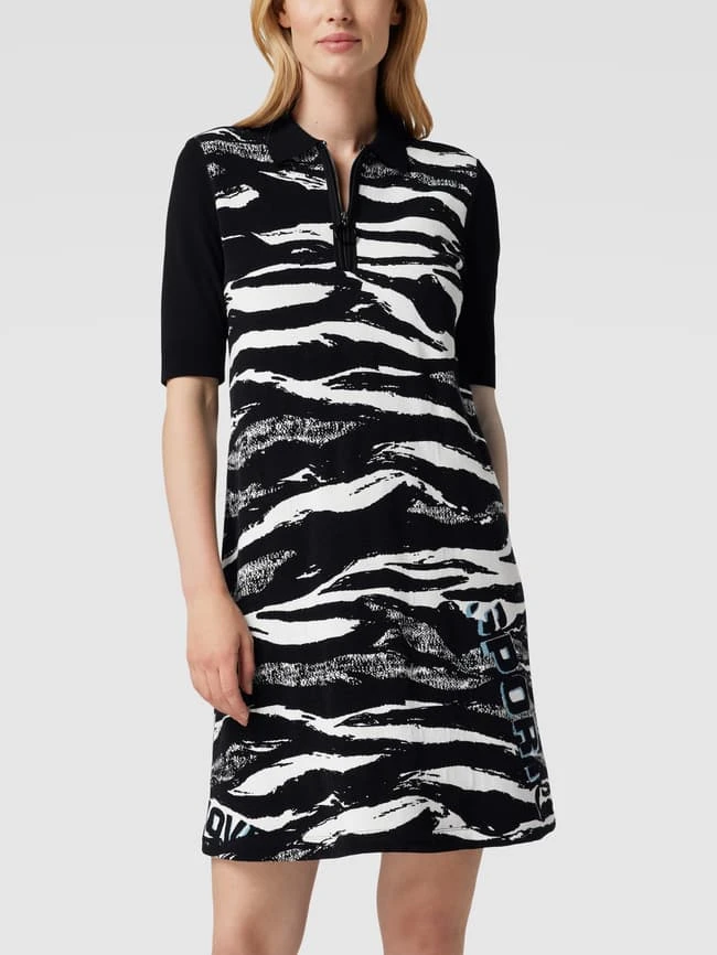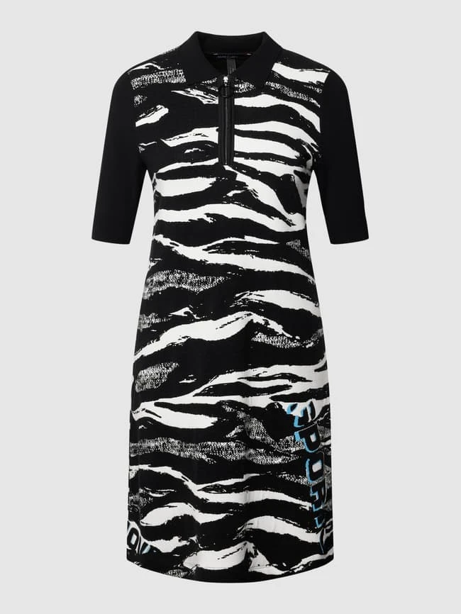 Das knielange Kleid von Marc Cain ist aus einem Viskose-Elasthan-Mix gefertigt und im taillierten Schnitt gehalten. Es zeigt sich mit Allover-Muster, Galonstreifen und Polokragen.