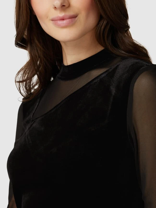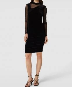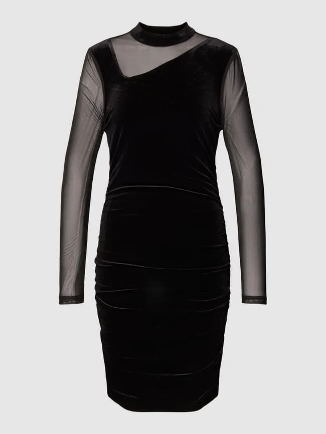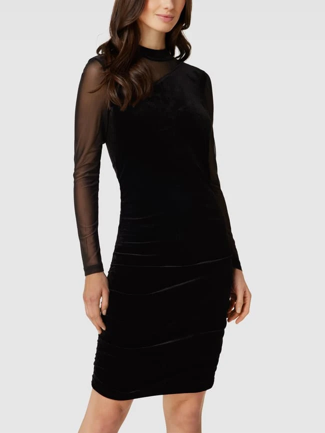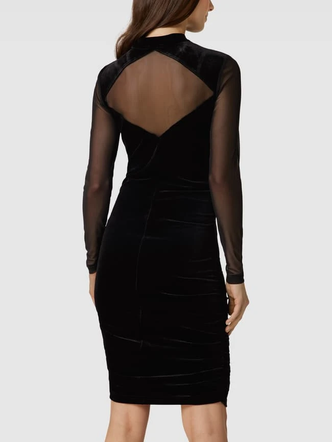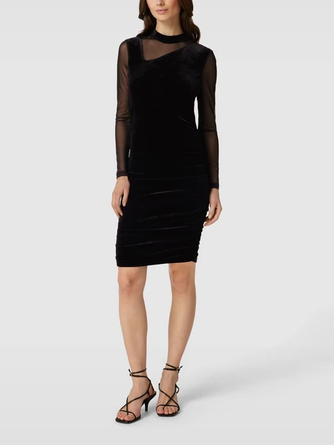 Das knielange Kleid von mbyM ist aus einem Material-Mix mit Stretch-Anteil gefertigt und in eng anliegendem Schnitt gehalten. Es zeigt sich mit transparentem Obermaterial sowie Stehkragen.