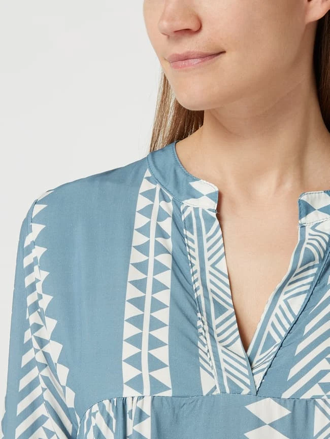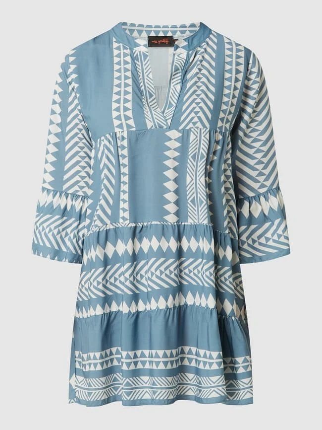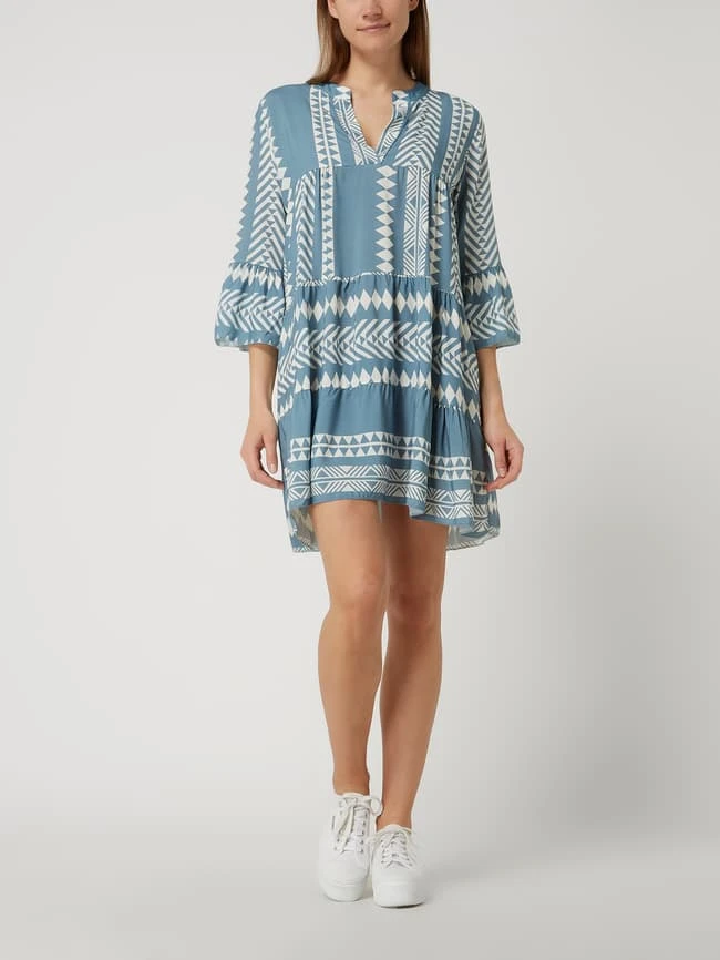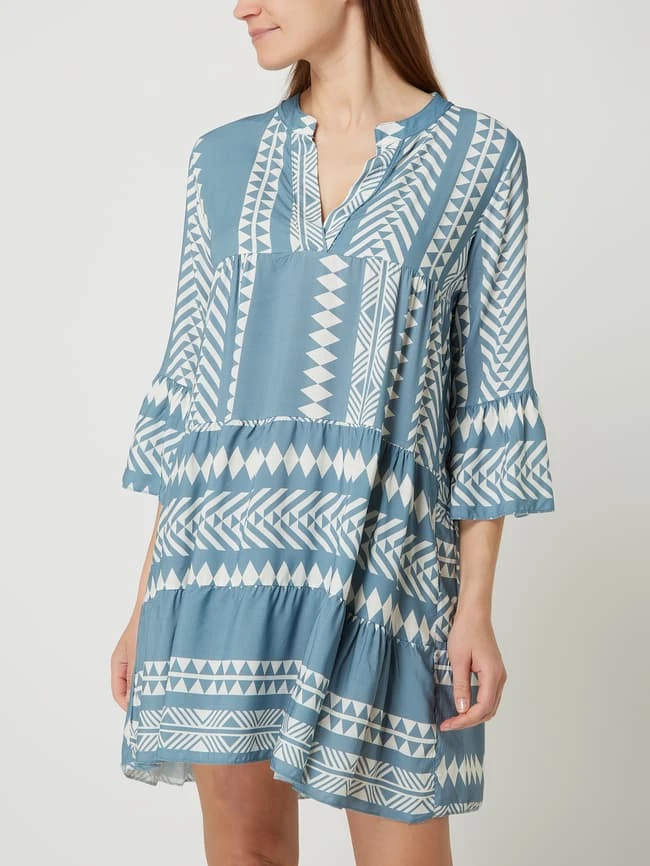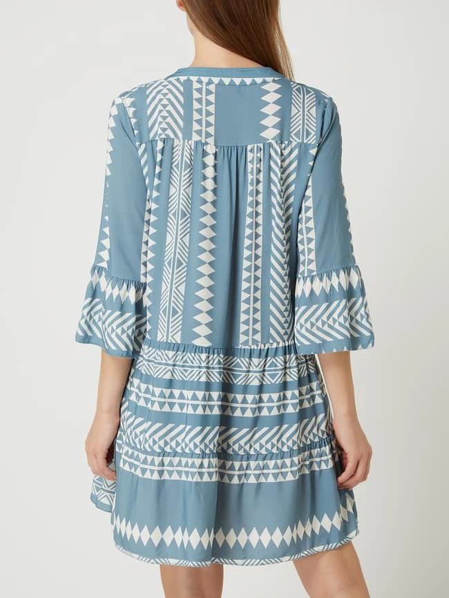 Das Kleid von miss goodlife ist aus reiner Viskose gefertigt und ausgestellt geschnitten. Es kommt mit Ikatmuster, Trompetenärmeln in 3/4-Länge und Volantsaum.
