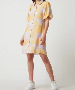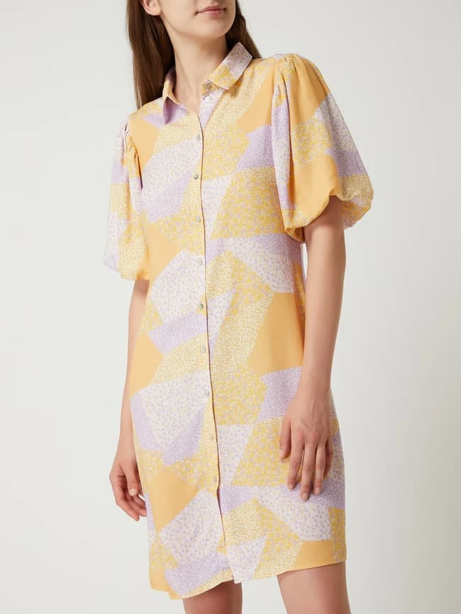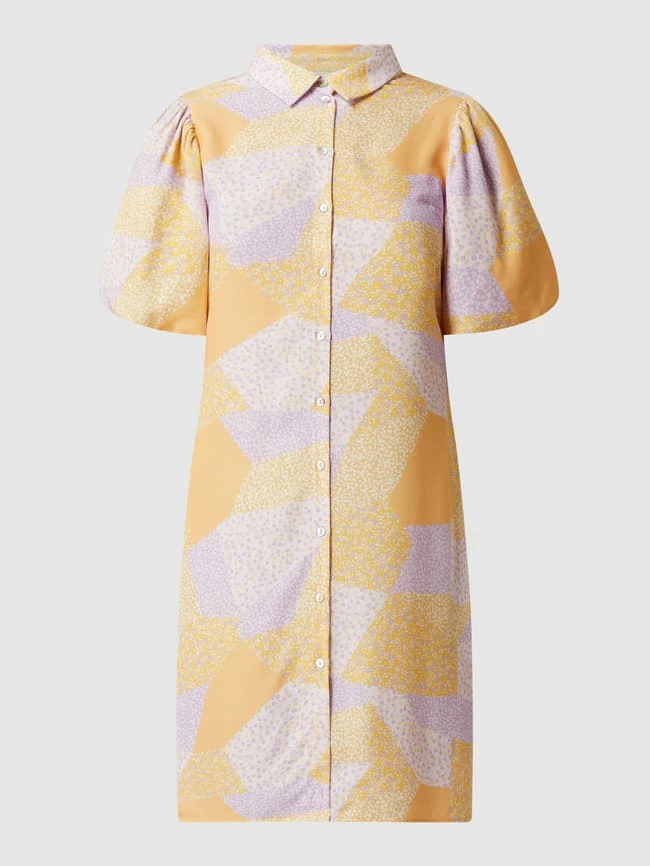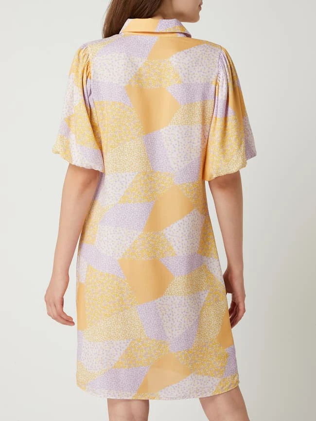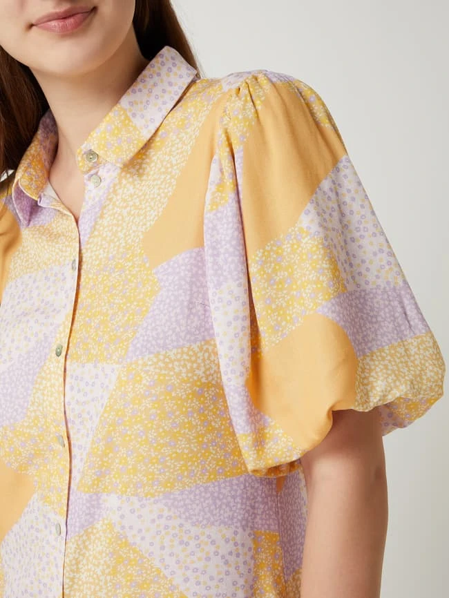 Das Blusenkleid von moves ist aus reiner Viskose gefertigt und leicht ausgestellt geschnitten. Es kommt mit Allover-Muster, Umlegekragen und kurzen Puffärmeln.