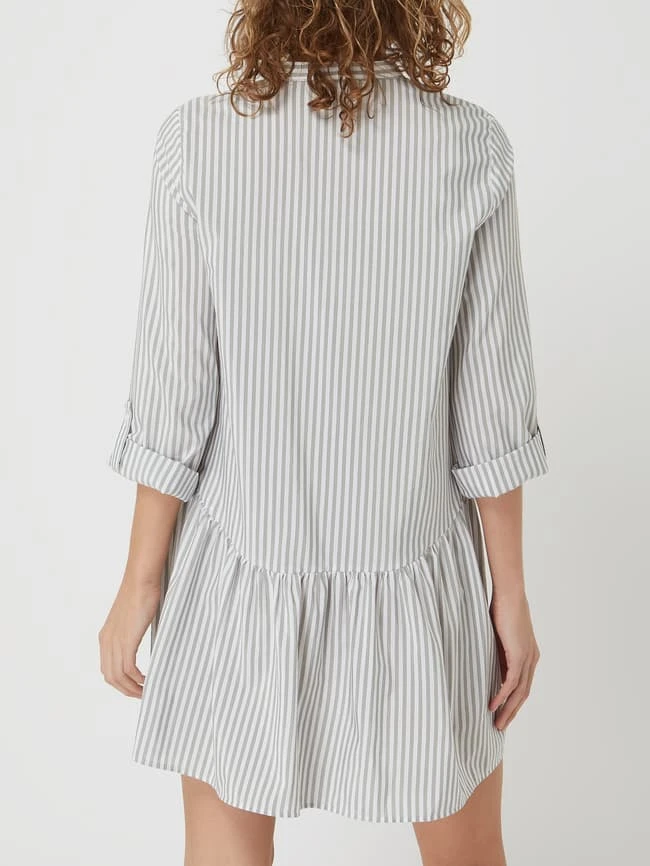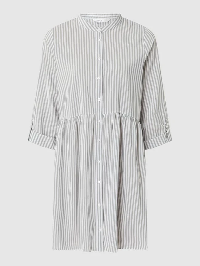 Das Blusenkleid von ONLY ist aus einer Baumwollmischung gefertigt und ausgestellt geschnitten. Es zeigt sich mit Streifenmuster, Knopfleiste und regulierbarer Ärmellänge.