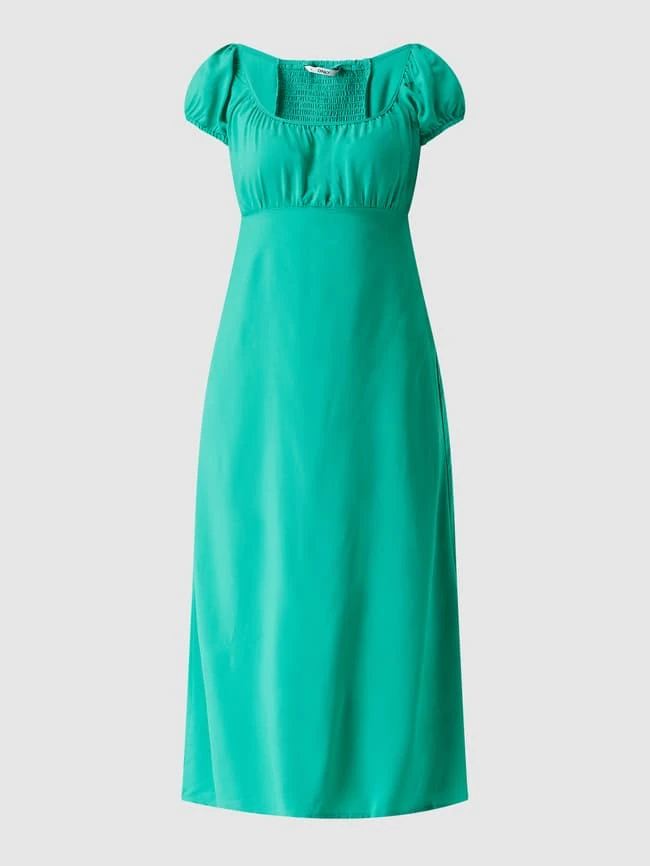 Das Midikleid von ONLY ist aus reiner Viskose gefertigt und tailliert geschnitten. Es zeigt sich mit kurzen Puffärmeln, ausgestelltem Rockteil und gesmokter Rückenpartie.