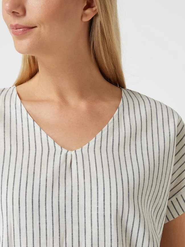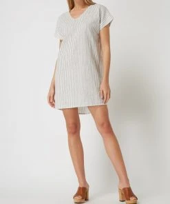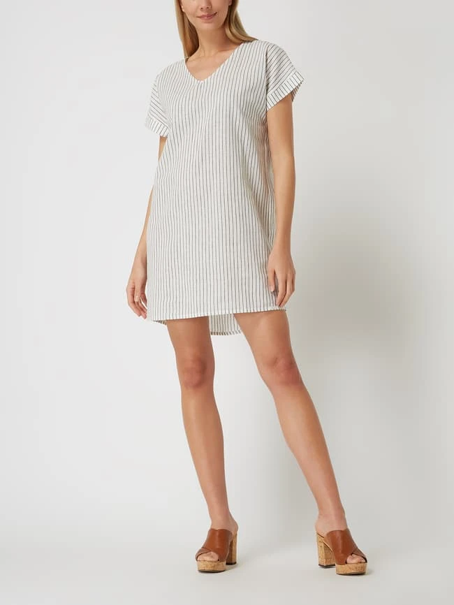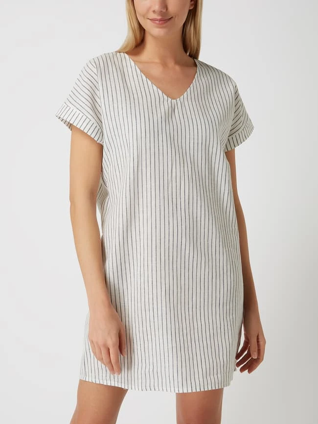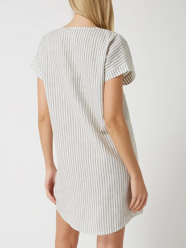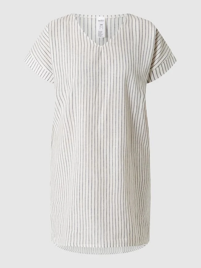 Das Kleid von Skiny ist aus einem Leinen-Baumwoll-Mix gefertigt und ausgestellt geschnitten. Es zeigt sich mit Streifenmuster, überschnittenen Schultern und leicht verlängerter Rückseite.