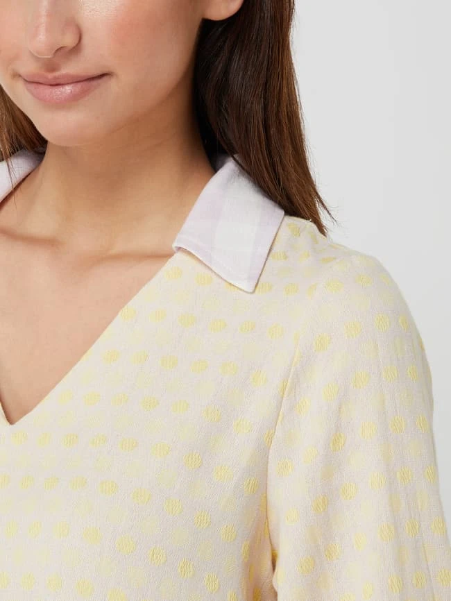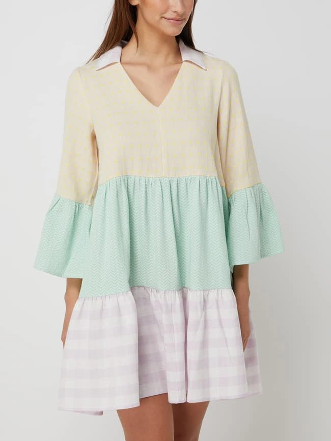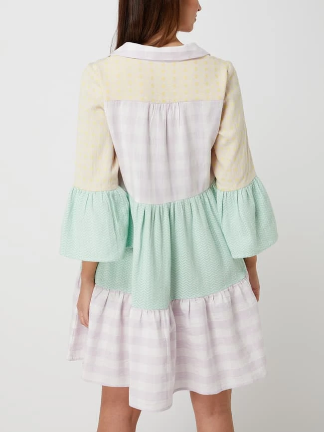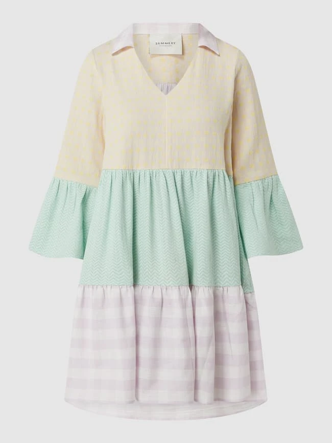 Das Kleid von SUMMERY COPENHAGEN ist aus reiner Baumwolle gefertigt und ausgestellt geschnitten. Es kommt im Stufen-Look mit Mustermix, Umlegekragen und Trompetenärmeln in 3/4-Länge.