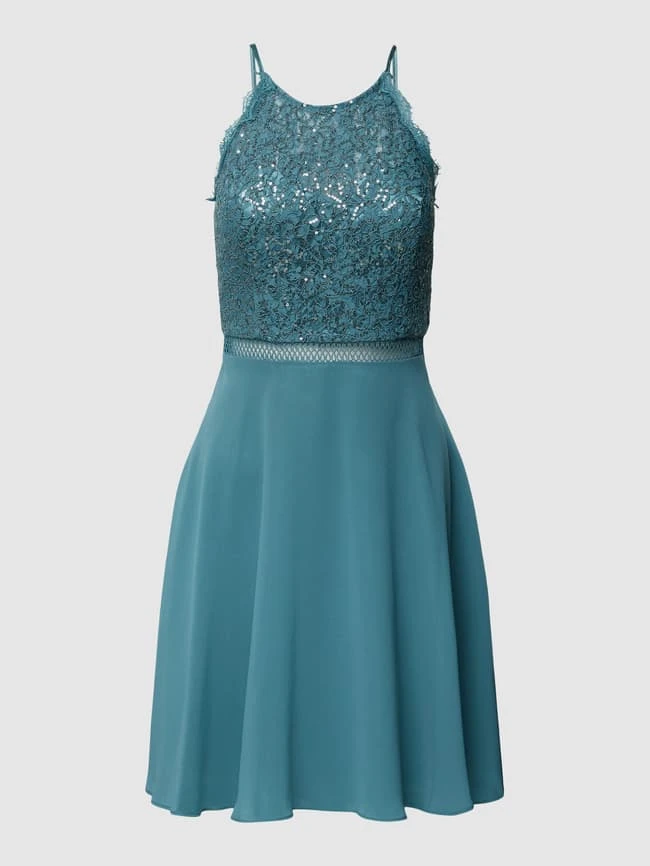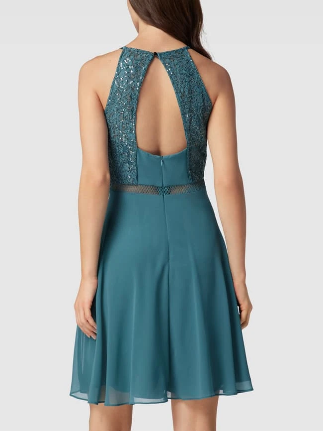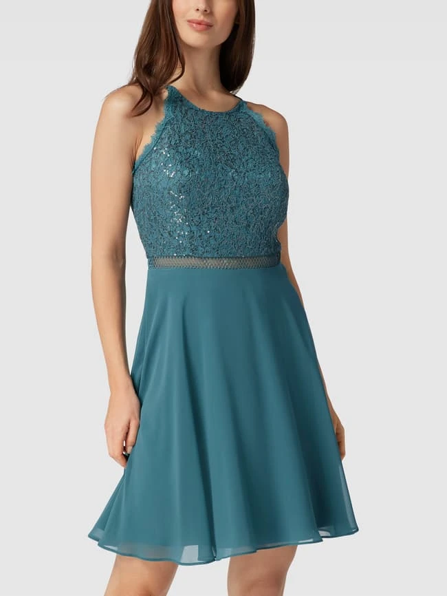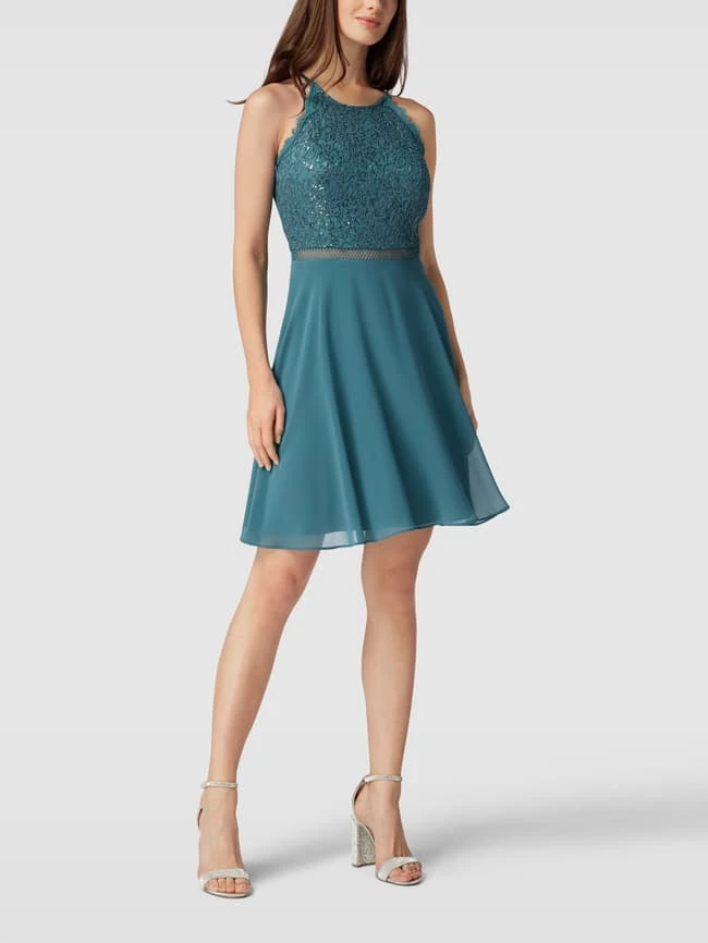 Das Cocktailkleid von Vera Mont ist aus strapazierfähigem Material gefertigt und ausgestellt geschnitten. Es kommt mit Spitzen- sowie Paillettenbesatz und Lochmuster in der Taille.