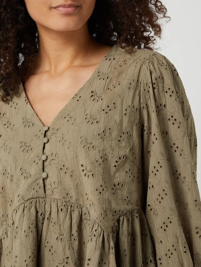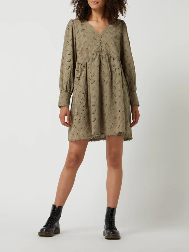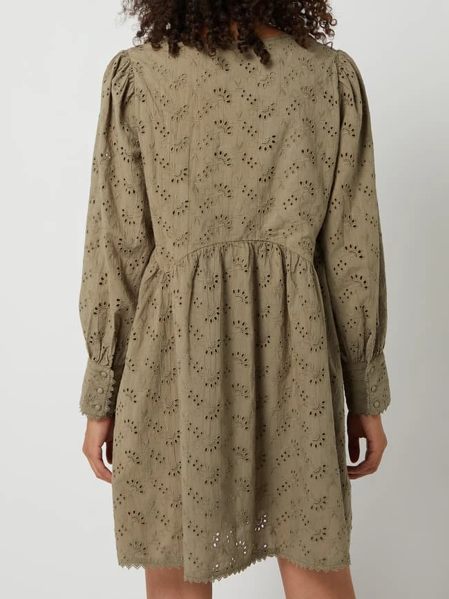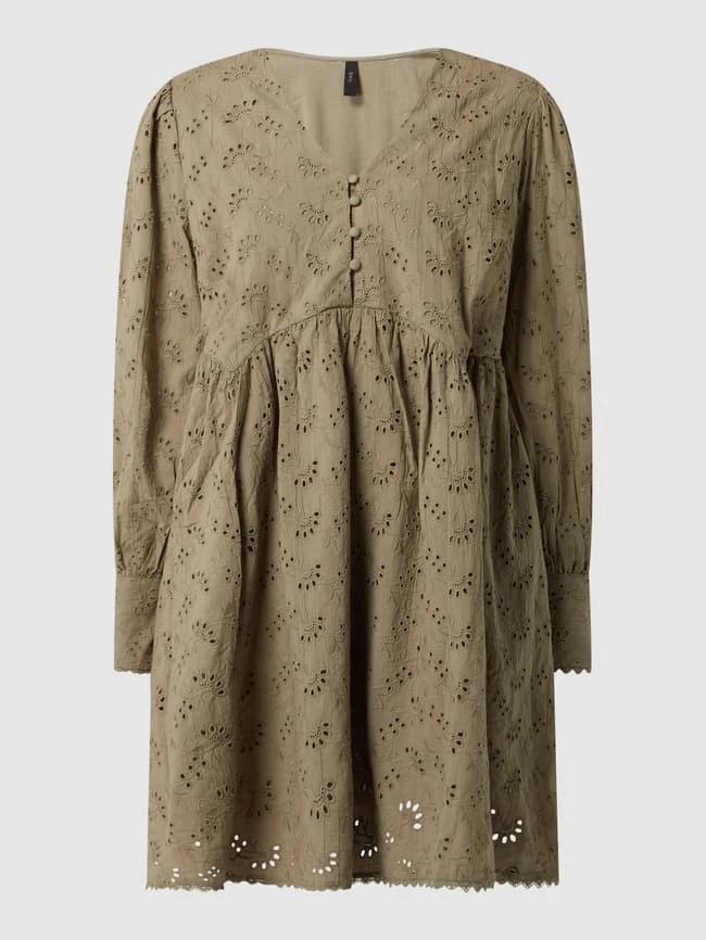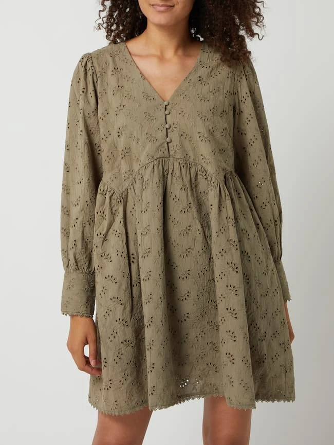 Das Kleid von Y.A.S ist aus Bio-Baumwolle gefertigt und tailliert geschnitten. Es kommt mit Lochmuster, V-Ausschnitt und leichtem Unterkleid.